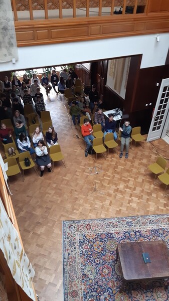 V úterý 17. března 2026 usedly dvě třídy nižšího gymnázia (2. A a 3. A) v improvizovaném hledišti neobvyklého prostoru. Výše uvedenou divadelní hru totiž žáci zhlédli ve foyer brněnské vily Löw-Beer a ukázalo se, že členové Divadla Husa na provázku zvolili tento prostor více než příhodně a citlivě. Zároveň pomocí prvků alternativního divadla vykreslili před zraky překvapeného publika dramatický příběh některých členů rodiny Strachovy a hlavně důležité modlitební knihy.