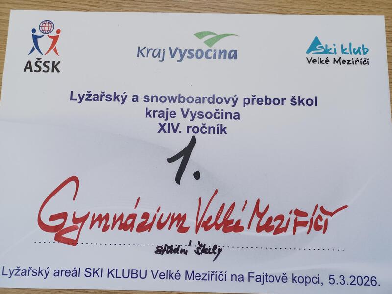 Dne 5. 3. 2025 se na Fajtově kopci konal Lyžařský a snowboardový přebor kraje Vysočina. V tomto poháru nás výborně reprezentovali vybraní žáci z vyššího i nižšího gymnázia. Největšího úspěchu dosáhli studenti vyššího gymnázia, kteří vyhráli celkové hodnocení v kategorii střední školy. Níže uvádíme nejlepší výsledky našich studentů.